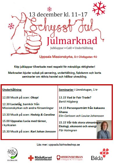 Årets tredje julmarknad för oss är Schysst Jul i Uppsala på självaste Luciadagen. Lördagen den 13 december kl 11–17 fylls Missionskyrkans lokaler på Sankt Olofsgatan av massor av rättvisa, schyssta och ekologiska produkter.