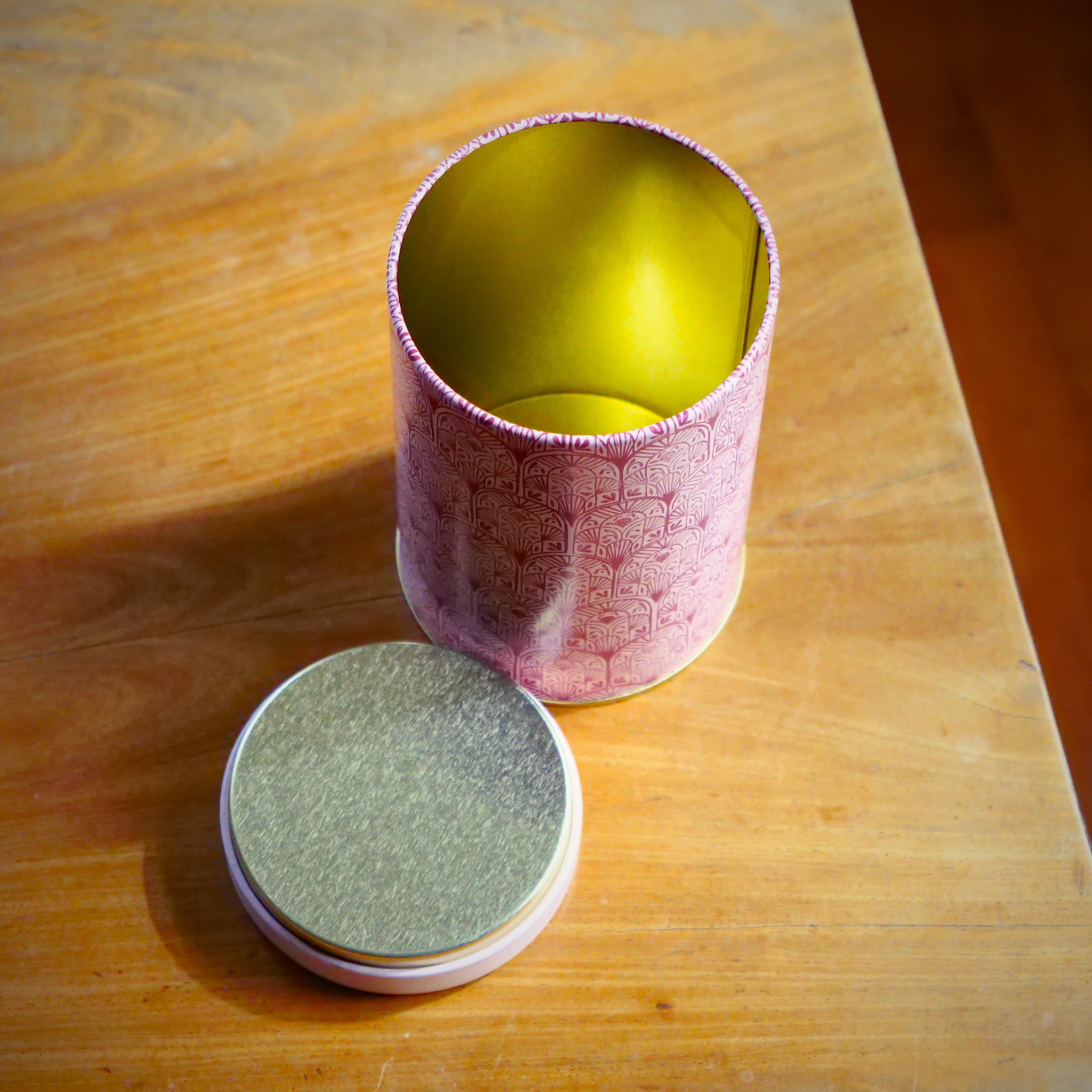 Rund teburk av bleckplåt i gammelrosa med ett mörkare mönster.