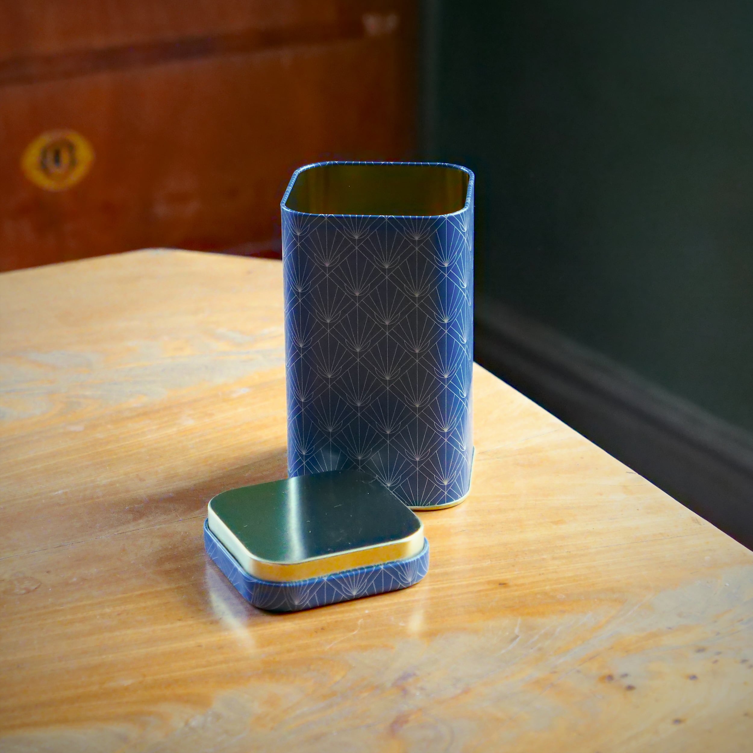 Teburk av bleckplåt i gråblått med ett stiliserat mönster i guldbeige.