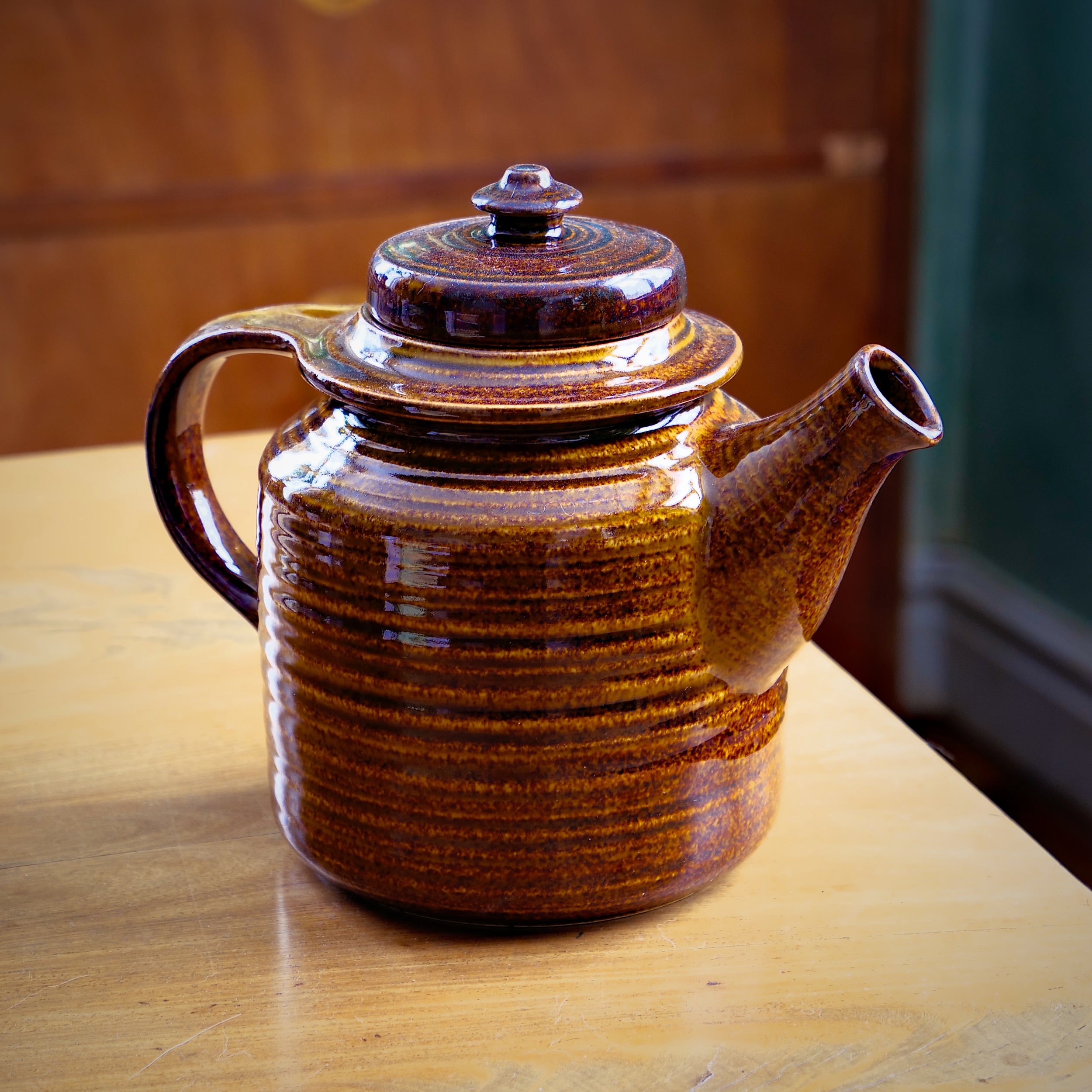 En 1960-talsklassiker! Tekanna formgiven av Ulla Procopé (1921–1968) för finländska Arabia. Tekannan gjordes i två storlekar, detta är den större. Den heter Mahonki = Mahogny. Den reliefartade glasyren är blank och brunmelerad.
