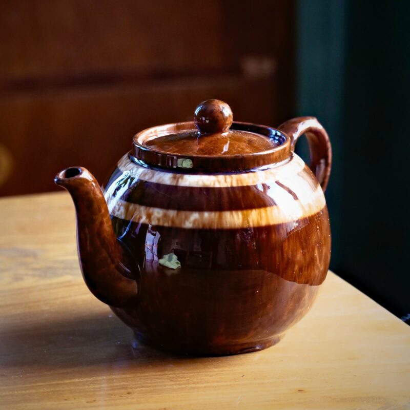 En tekanna i klassisk Brown Betty-modell som dekorerats med två ljusa ränder.