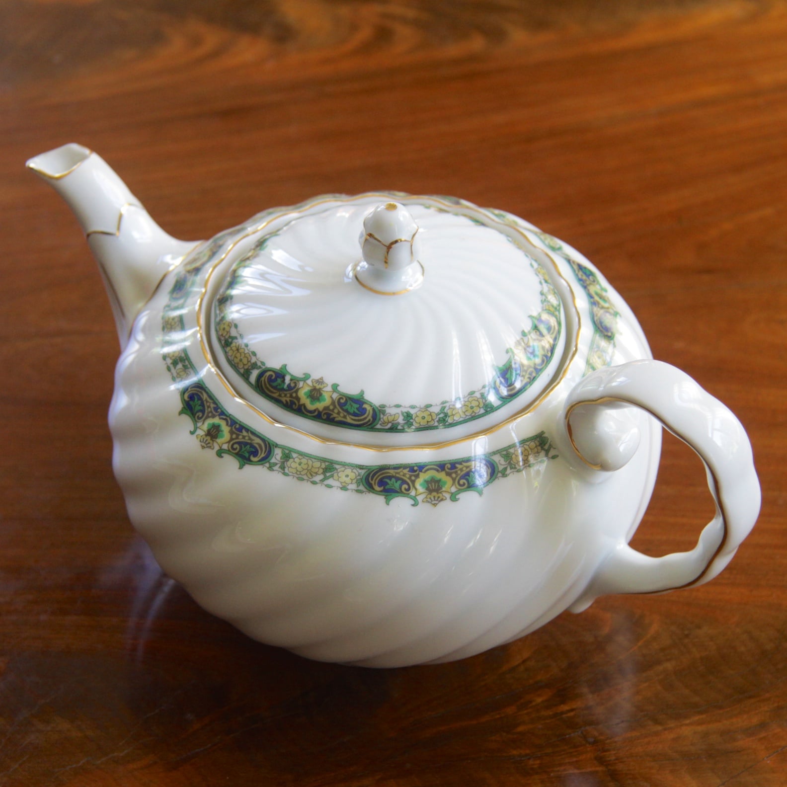 Elegant vit kanna med mönster i gult, grönt och guld. ”Cleo” tillverkad av tyska KPM mellan 1925-1945. Rymmer 1 liter. Droppar inte.
