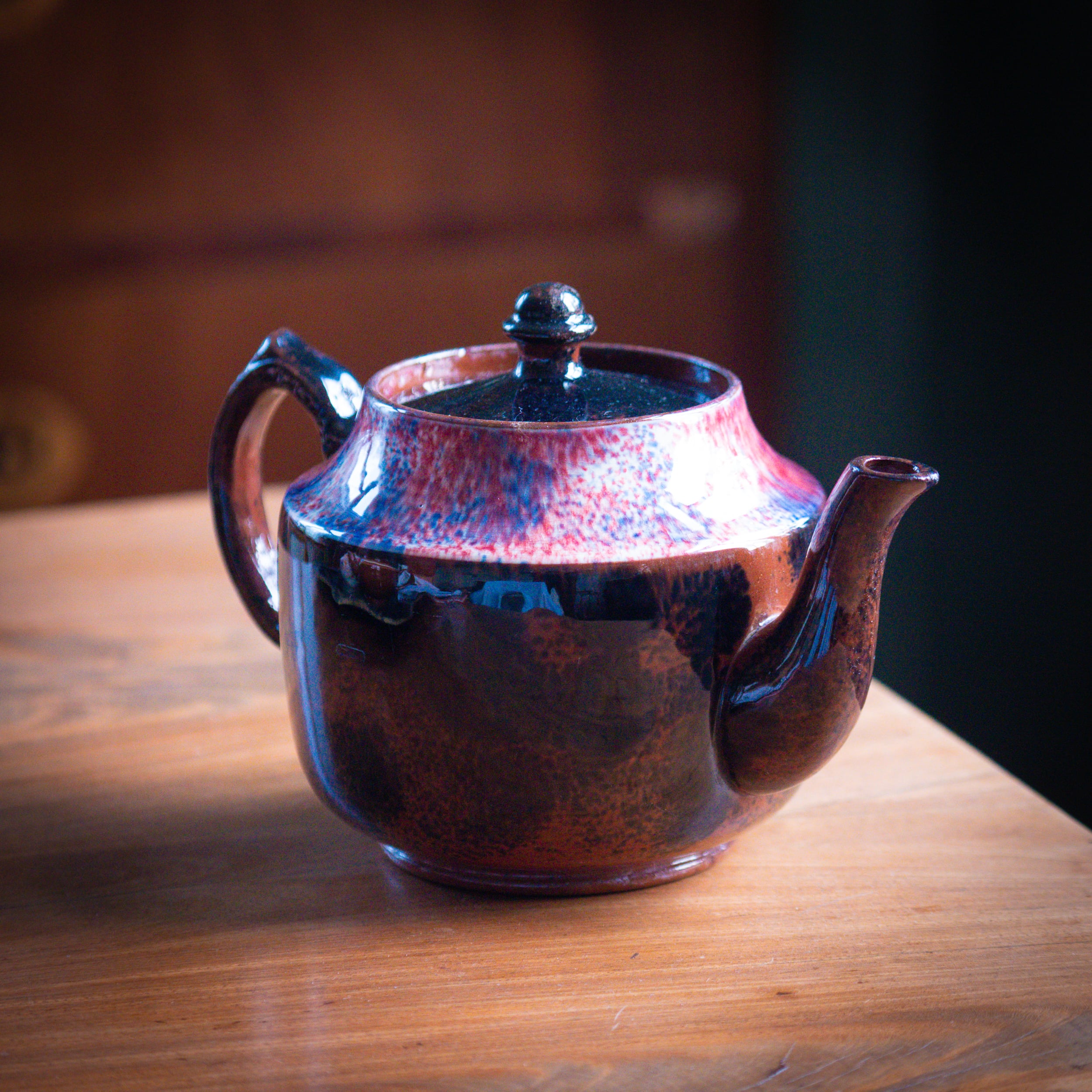Klassiskt formad tekanna med en spejsad bård i rosa-lila. Märkningen är mycket svårläst, men kan vara tillverkad av engelska Arthur Wood & son.