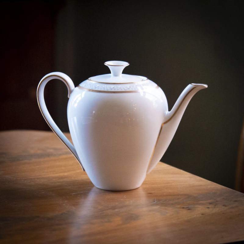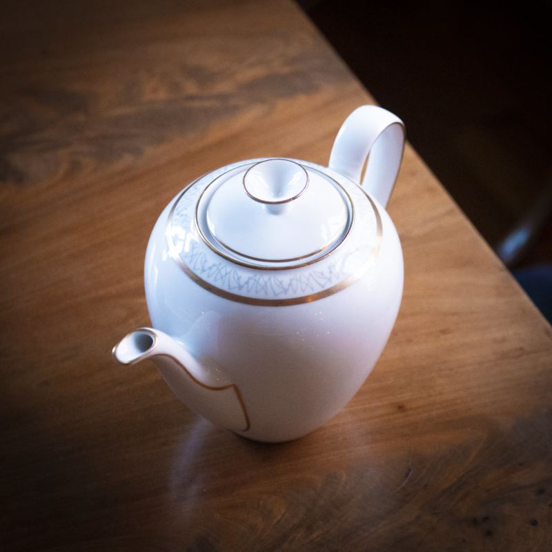 Kanske var detta tänkt som en kaffekanna från början? Hursomhelst, funkar fint som tekanna! Gjord av Karlskrona porslinsfabrik, som 1942 köptes upp av Upsala Ekeby. Det trassliga dekormönstret i grått andas mycket 50-tal och är en rolig kontrast till kannans eleganta form och klassiska guldkanter.